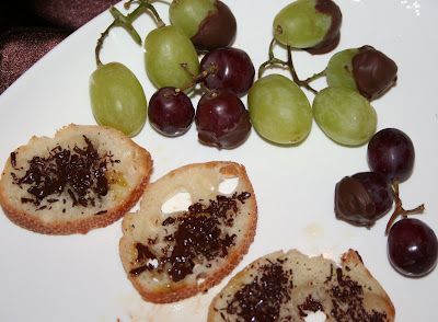 Other appetizers included this White Chocolate Camembert with Rosemary Pear Chutney(yummy—and half eaten in this picture). Toast with Chocolate and Fleur de Sel, and Chocolate Covered Grapes.
