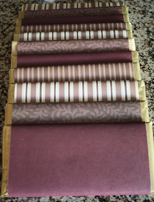 The chocolate brown table cloth is a poly satin fabric I bought at Hobby Lobby for 2.99/yd. I also bought the fusible tape to do the hem, so that it was a no sewing project. I also skipped the hemming and piled up the remainder of the fabric in the center of the appetizer table.