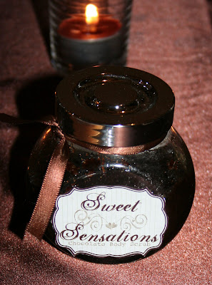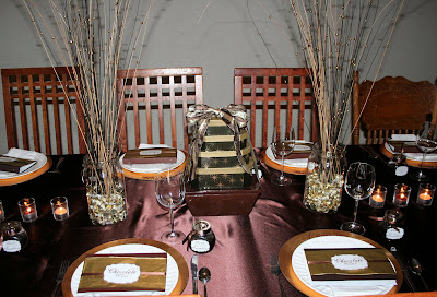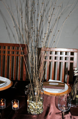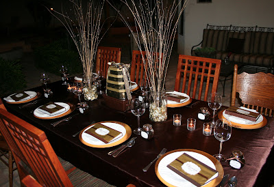 I was in charge of all of the pretty stuff, and my partner, Tina, did the bulk of the recipe finding and cooking (with a few important exceptions), and she let us have the dinner at her fantastic home (which I am planning to blog about one of these days soon!). We set up the dinner on her back patio (yes, we are in Arizona!). I had a different color scheme in mind until I saw the Godiva Chocolate room, and knew that the brown and gold would give the feeling of rich decadence I was going for.