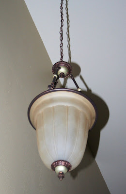 The light on the left is what was in there before, and it was really wimpy looking in that large room. The lamp on the right is what was hanging in my entry way before we did this (I think I still have both of these, if anyone wants them):