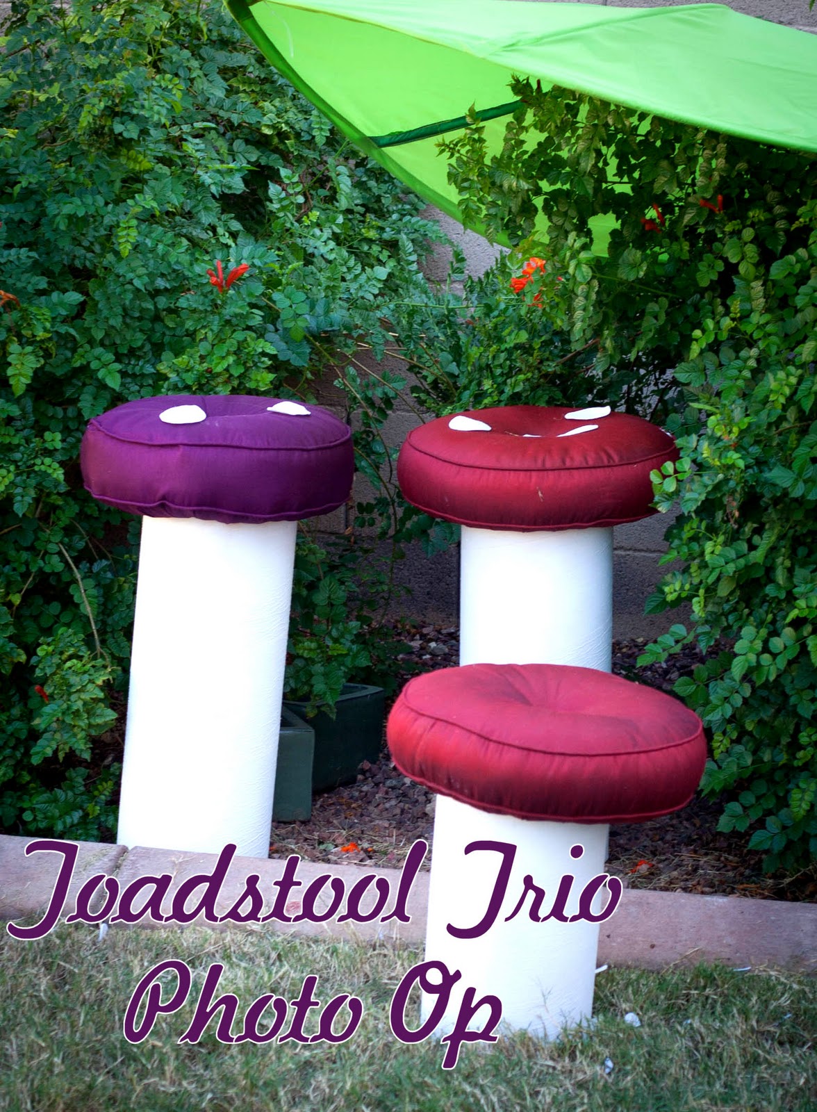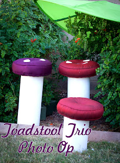 PARTY SECRET: The bases of the toadstools are made from an 8″ concrete form sawed in pieces and spray painted white. The tops are just round decorative pillows with white felt circles.