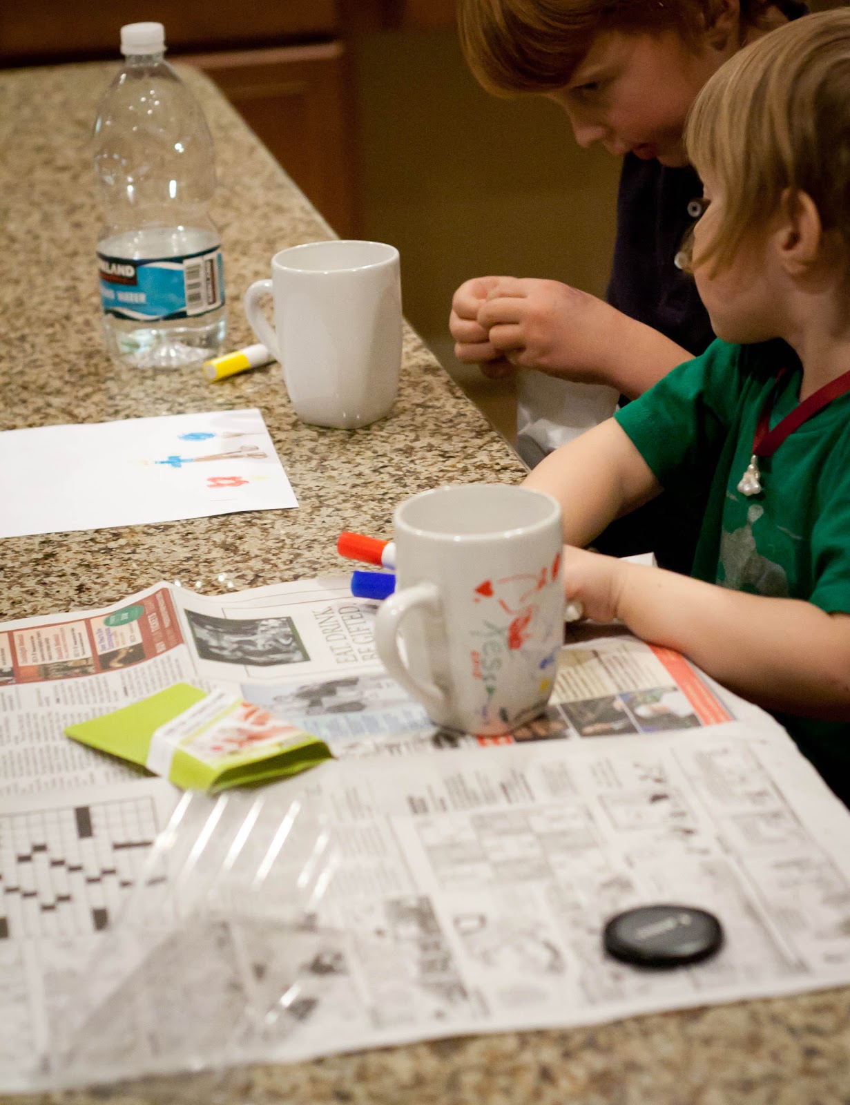 I borrowed this idea directly from Design Mom, although her version is a bit neater. I wound up letting my kids pretty much have free reign, which they loved. Design Mom bought her white mugs at Goodwill. I found mine at the Dollar Store. We both got our Porcelaine pens at Michaels. I got the four pack with red, yellow, green, and blue pens. I really wish I had remembered a Michaels coupon, because the set ran about $16 for the four pens. But the thing that is great about this product is that after you bake the decorated mugs for 35mins., they are dishwasher resistant, and hopefully can be used like any other mug. I saw a lot of kits with mugs to decorate at Michaels, but they aren’t intended to be used or washed, and I like giving gifts that are functional.
