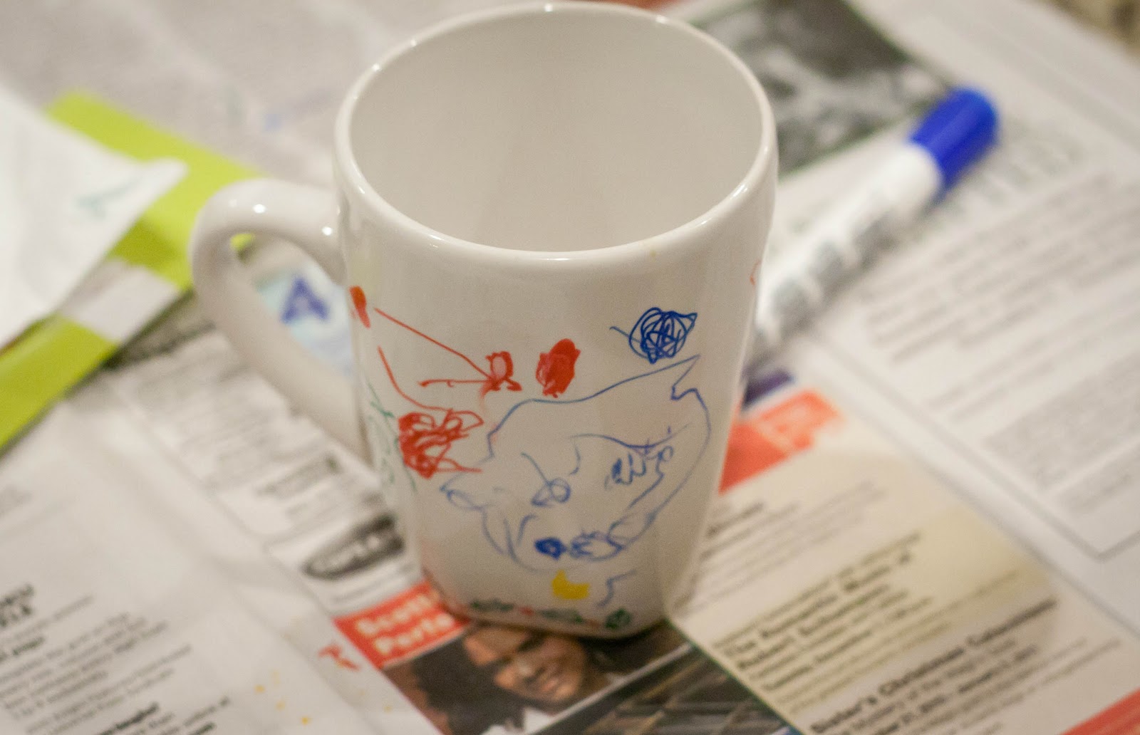 My three-year old wanted every square inch of the mug covered with her pretty designs. I put a holly border on the bottom, but probably shouldn’t have since she was so thorough in covering the mug.
