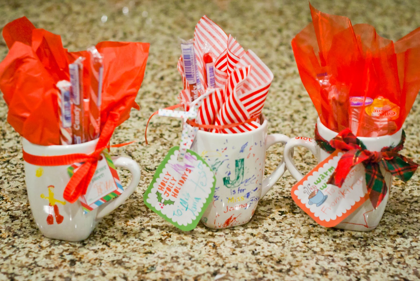 I was going to go with a homemade hot cocoa mix inside, but was running out of steam and time, so I just put a couple of packages of Swiss Miss in the mug as well as some candy sticks and mini flavored creamers so they could make their cocoa more exciting, if they choose.