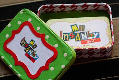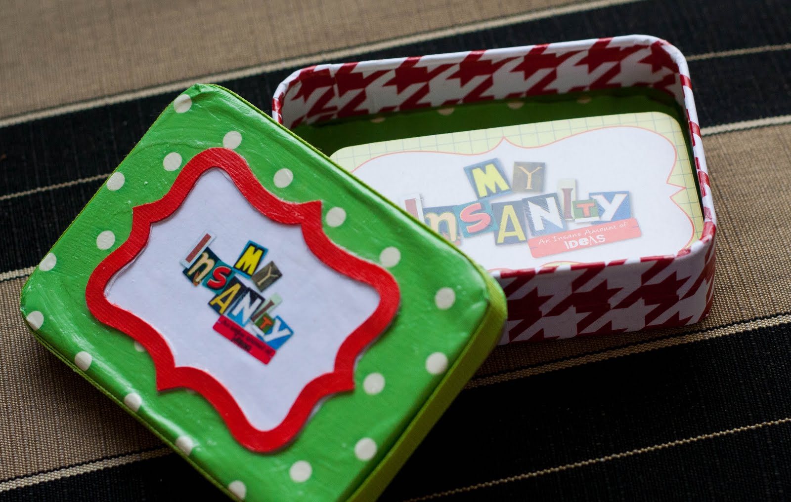 I used an exacto knife to trim the edges, and a ribbon to cover where the knife hadn’t been so exact. I had BSB print out my logo on a laser printer so it wouldn’t bleed and cut the red frame with my Silhouette. I mod podged it all on the top of the lid.