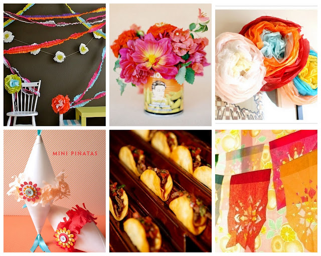 Bottom Row (L-R): Mini Pinatas: One Charming Party, Mini Tacos: The Knot, Papel Picado: Etsy Shop De Colores