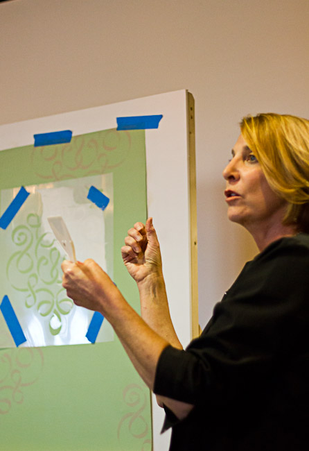 Her big secret: Off-loading. She uses a bristled brush (not a roller or a foam pouncer), but off-loads a ton of paint before applying it!