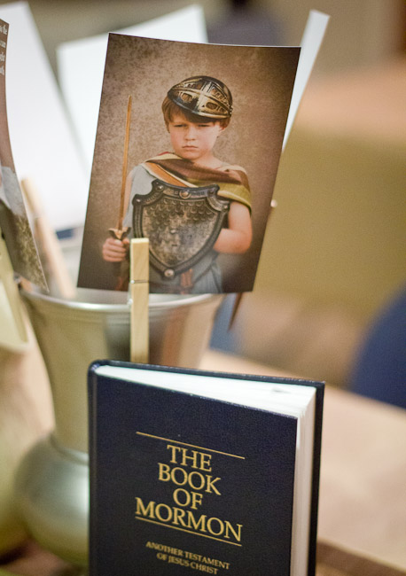 I decorated the tables with brown rolls of painter paper, fabric from the costumes, and vases and pottery that looks like it could have come from Book of Mormon times. I also set scriptures on each table, in keeping with the modern to old connection from the invitation. I loved the pictures from my son’s photo shoot so much that I used clothespins to display some of them at each table, so they could get an idea of his many faces.