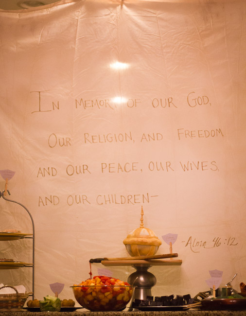 The back drop is Captain Moroni’s Title of Liberty (Alma 46:12). I took an old white sheet and tea stained it, before tearing/cutting a jagged edge on the bottom, and using a brown sharpie marker to write the words of that scripture.