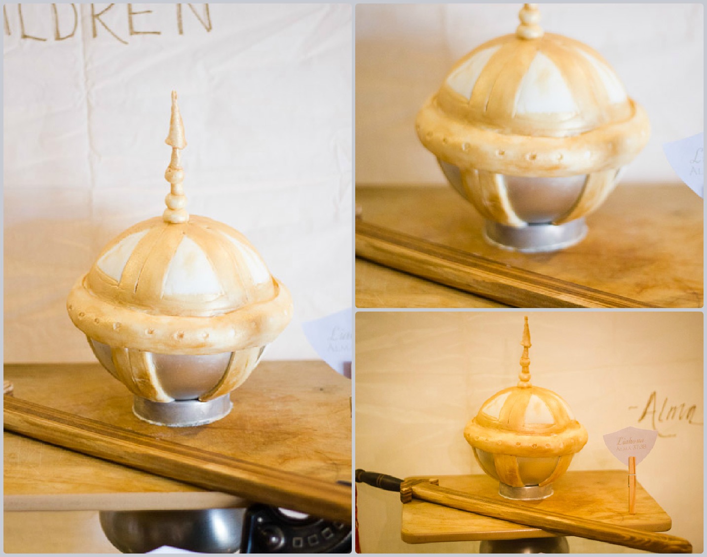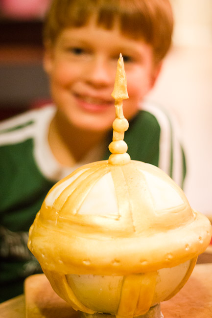 I used my trusty Wilton Sports Ball Pan Set (use it all the time) to make the cake. This time the birthday/baptism boy requested carrot cake. I’m not sure if it wasn’t baked through, or just because it is such a heavy cake, but I nearly had a cake fail as the weight of the top half of the sphere was smooshing the bottom half. I could have re-made it out of cereal treats (Rice Krispie Treats), but with the time I had available, I did a cheat, that actually worked really well. I set the whole cake back into one of the pans it had baked in. So the silver part of the cake is actually a cake pan. I used fondant details on top of the pan and cake to make it look like it was supposed to be there. I stuck a dowel through the cake and made balls and the topper out of fondant. I gently pressed some details into the fondant with a skewer. Then came the fun part! Painting with Luster Dust. It is the same technique that I used for the disco ball cake and is really easy to do, if you get a good ratio of liquid to Luster dust. For this one, I used dark vanilla as my liquid this time so that I would have a darker gold color.