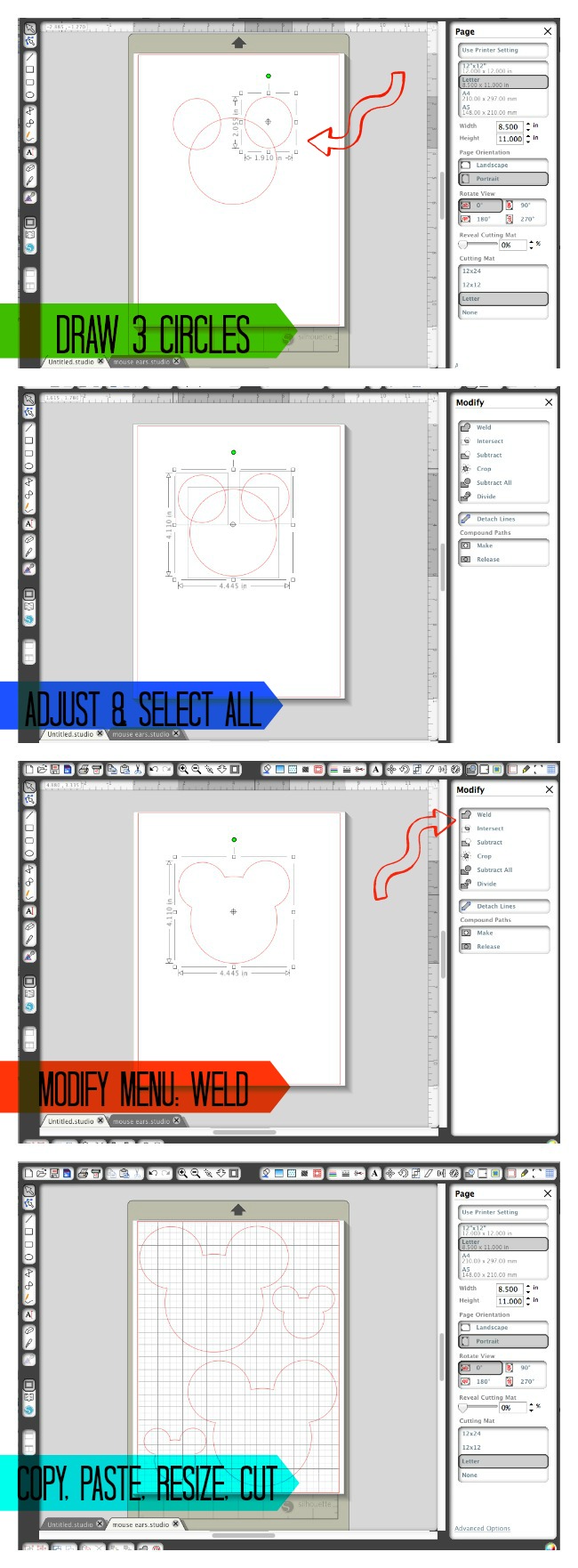 One of my favorite things about Silhouette is how it is set up to give us creative control over what we cut. I didn’t really want to go and purchase someone elses design for these, so I downloaded a free font (Waltograph) and with three circles and a few minutes, I had created my basic mouse ear shape.