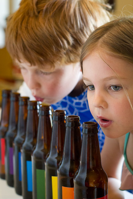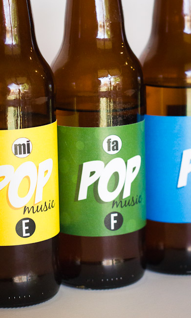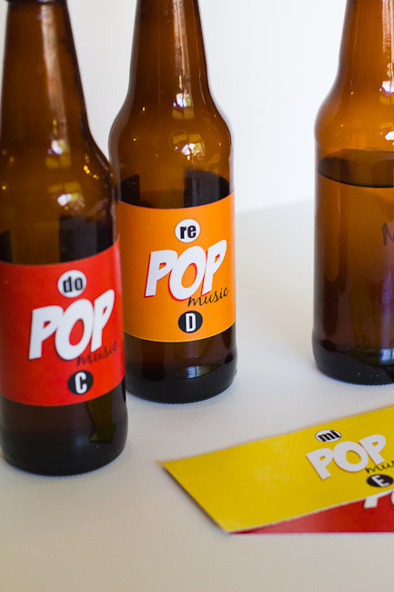 If you would like to make your own “POP music” bottles, I recommend filling the bottles with water before adding the labels, since there will likely be a bit of trial and error–adding water and dumping it out, before you get just the right pitch. More water makes a higher tone. Less water makes it lower. After tuning each note, I took a sharpie and wrote the note name on it so I wouldn’t get confused. I printed my labels on full sheet label paper at the copy store. Then just cut them in strips, peeled off the backing and applied them to the bottles.
