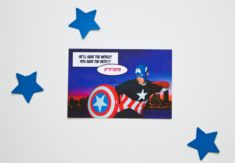 Since this was a costume party, we sent out Save-the-Dates last October, so that people could have the opportunity to get costumes while they were still in the stores. I started with a photo they had of him in his Captain America costume and extracted it from its background and placed it on top of a stock cityscape. I intensified all of the colors to make it look like a cartoon and added the bubbles “He’ll Save the World! You Save the Date!” And the date of the party.
