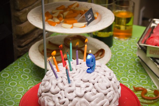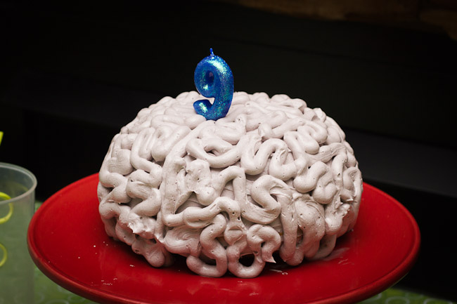 And the brain cake was pretty fast and easy to put together. I baked it in a Pyrex bowl and just used a large tip to pipe on the brain squiggles after frosting a quick base quote.