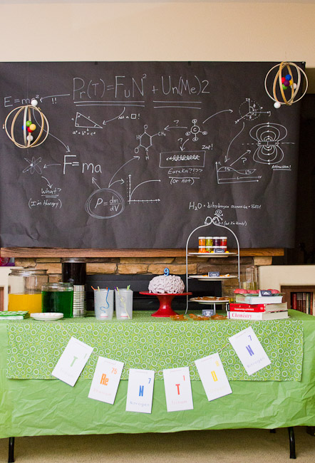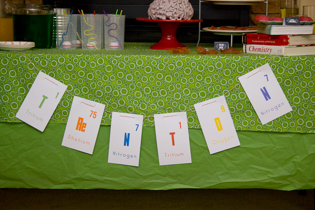 We also made sure each had an ample supply of H2O for proper brain function. Most of the favors as well as the paper goods on our table came from Oriental Trading Company. For direct links to the individual products, please visit my Science Birthday Pinterest Board.