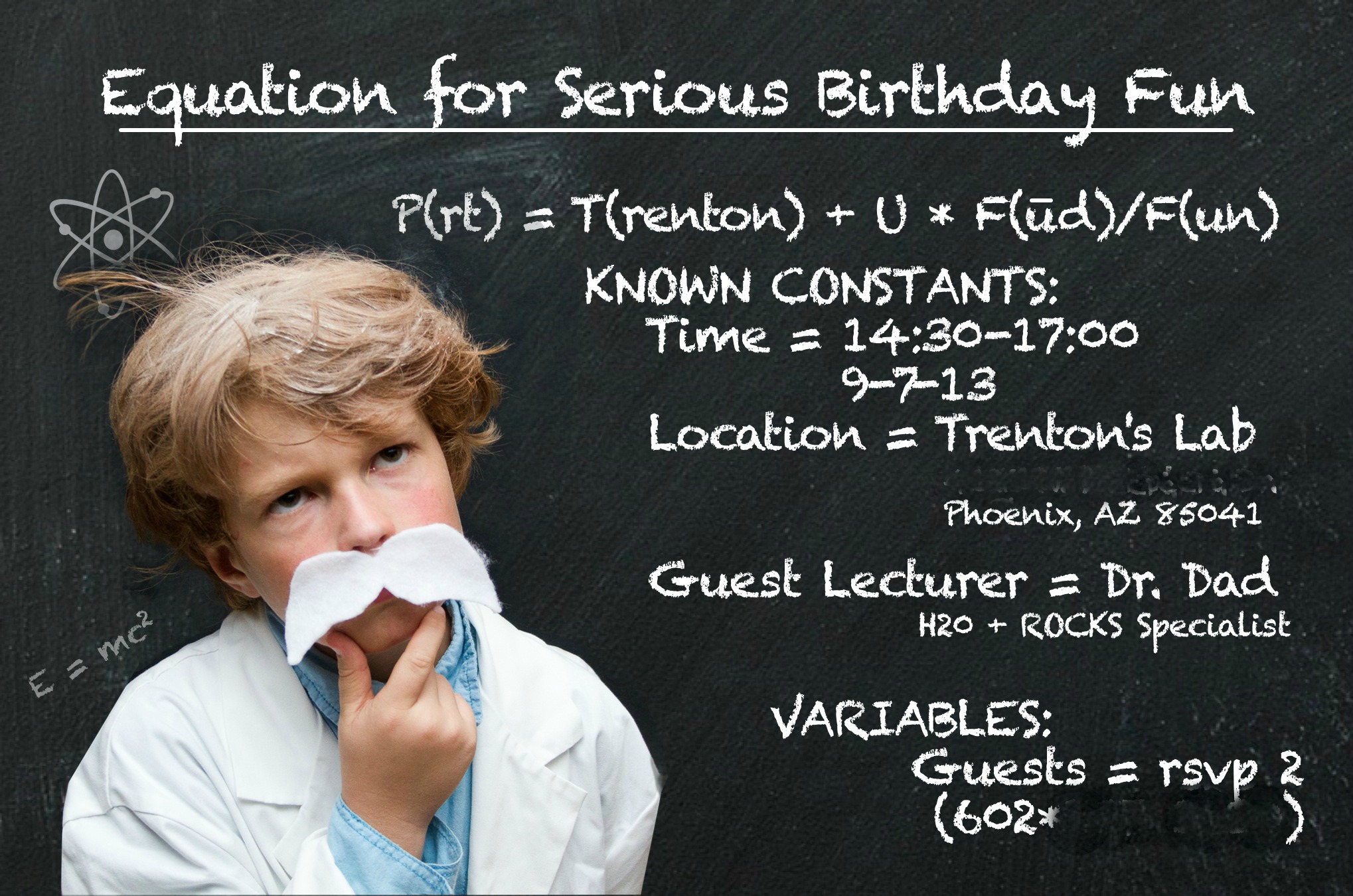 We set the tone for the party with this invitation. I did a little photoshoot with my son in front of a chalkboard that I blended with a chalkboard background and added all of the party information to look like chalk writing later. We were going for Albert Einstein, if you can’t tell, but Grandpa said he looks more like Mark Twain. What do you think? I had my geologist husband help me out with the scientific terminology and equation (so if you take issue with any of it, it is his fault. :-)) I almost always deliver real invitations to a party, but when it became clear that I wouldn’t have time to get mailing addresses for all of his friends, I settled for an online invitation. I just had to find one where I could upload my own invitation.