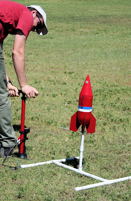 Here is BSB (Boy Scout Barry) launching the water rocket with the PVC launcher he and our friend, Anson, made. I won’t pretend I know all of the specs on how he built the launcher, but these pictures give you an idea of the set-up, using the bicycle pump to build up the air pressure enough to get them to launch. I tried to get a picture of the actual take off, but they were too fast!