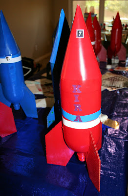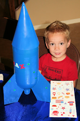 My husband and I used empty 2 liter pop bottles, glued on fins and nose cones and spray painted it all to make the rockets. This post has the link where we got a lot of ideas and instructions.