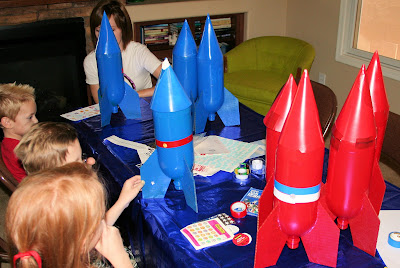 We let the children decorate their rockets with stickers and colorful electricians tape as the opening activity of the birthday party.
