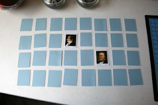 We also sent out a short survey by e-mail to the teachers to find out more about them. We asked them questions such as their favorite food, favorite color, favorite sport, and types of pets they owned. I compiled this information and used clip-art to make a memory match games. For instance, if the answers to the questions were pizza, red, basketball, and two dogs–I would create two 8.5×11 sheets of paper with a red splotch, two papers with a clip-art image of pizza, two with an image of a basketball, and two with an image of dogs. After printing the images they were mounted on cardstock and the game was ready to be played on the floor with the same rules as any game of Memory.