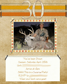 Erin (the one who is throwing the hunting party) sent me a copy of the invitation she made to post. (Erin, I am assuming your husband doesn’t read this blog, since this is a surprise party). Anyway, I love the hunting terms “you’ve been drawn.”