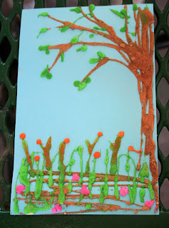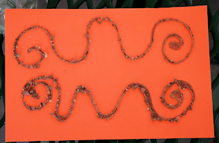 The credit for this one, goes entirely to my sister, Shanda, who is genius when it comes to entertaining and interacting with children. We were in charge of crafts with the 7-11 year olds at the family reunion, and this was one of the projects we did. Since we were camping, we used natural dirt as the main element on colorful paper, and then let the kids use colorful sand from one of those bottle kits to make what ever designs they wanted.