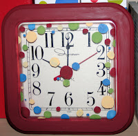 I will end this novel-length post with a project for the loft that is already complete. I’ve had this clock for ages and it was getting boring. I was on a spray paint kick a couple of weeks ago and decided this needed a face lift (get it?). The dots on the acrylic came out of the need to cover up some of my over spray that tape didn’t prevent. This was all done before I found the Dick & Jane fabric, but I am loving how the old-fashioned numbers tie in with the vintage feel of the books, but the dots keep it young and fun. Oooh! I could always rub on letters on the red part that say some thing like,”look!” or “see the clock!” in a small font.