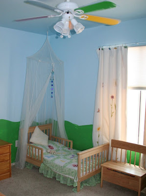 #8–Kids’ bedroom–Not a perfect picture since my daughter had some interesting ideas about where her pillow, etc. belonged. Again, we painted green hills all around this room. I even let my daughter help paint. The room is bug-themed and the curtains are actually a shower curtain, cut in half, hung by cut bug shower curtain holders.