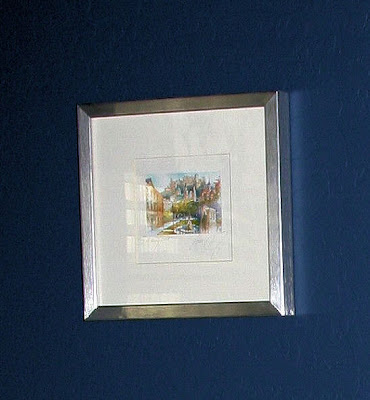 #9-Powder room–More paint. I’m not sure the photo captures the true color of the deep blue I painted in the powder room. I love how the white sink, etc., popped against it. This water color is one I purchased on the street in Salzburg, Austria for about 10 euro. It is really lovely!