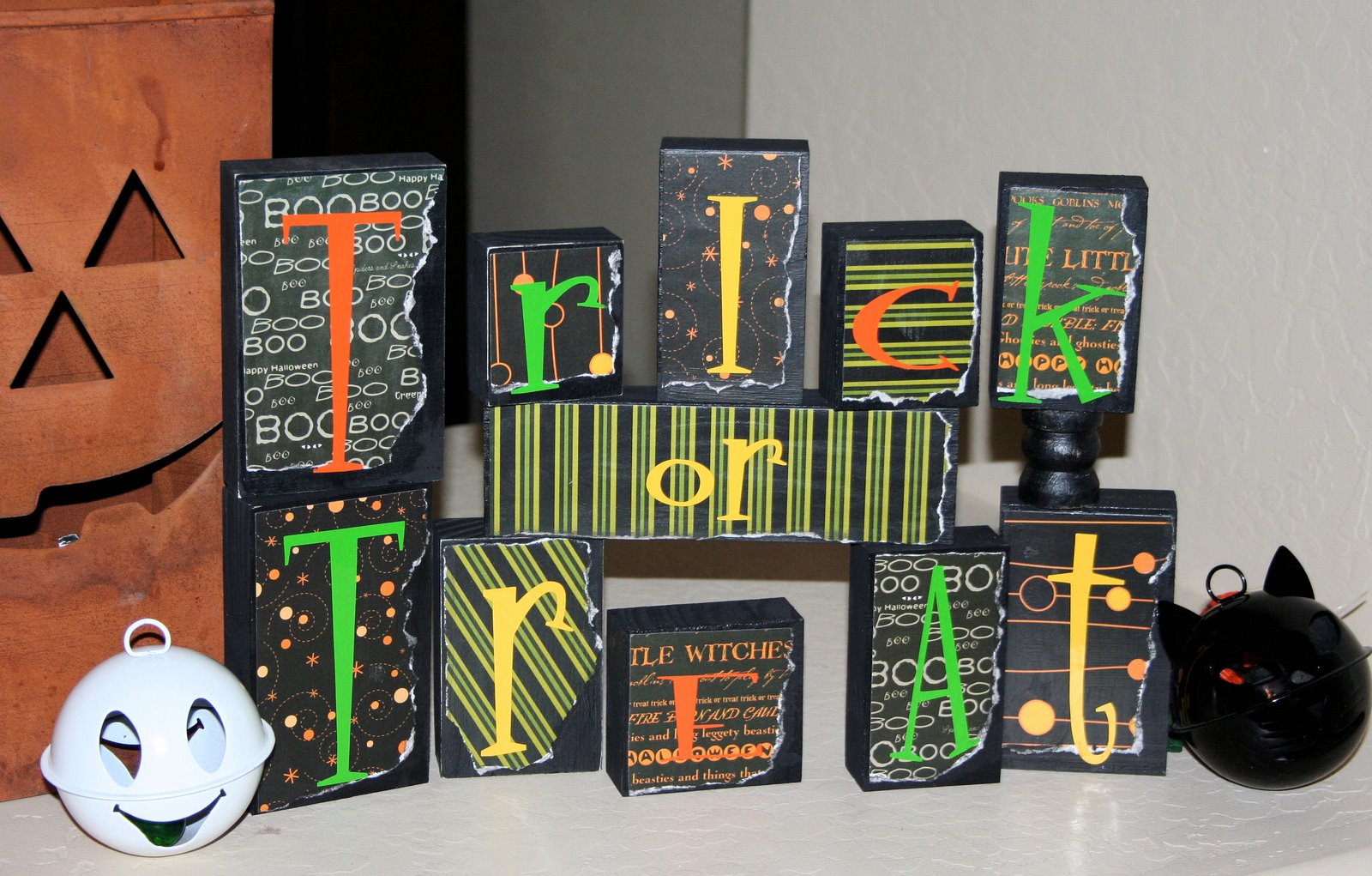 In fact, the only reason these got done is that my friend Shellie orchestrated the project and brought me the materials. All I had to do was paint/sand the blocks and apply the vinyl letters (I actually let my kids do the painting). It was too easy–so I made mine a little more difficult. I used Halloween scrapbook paper, tore it to size (much easier than cutting) and modge-podged it to the blocks before applying the letters.
