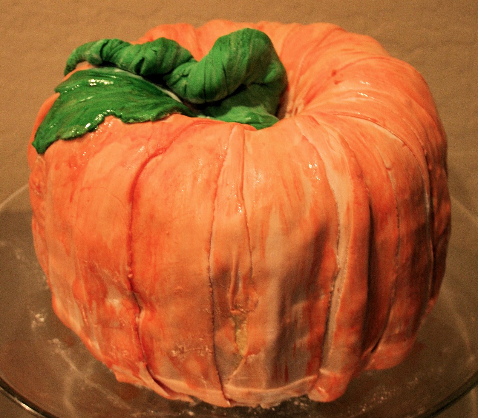 I found this recipe for homemade fondant and was curious to try it out and see if it is any tastier that purchased fondant. It is, I think. And probably wouldn’t have been that difficult to work with if I had remembered the Crisco on the hands part. I applied the fondant in strips (using the remaining whipped cream frosting as glue), giving it more of a rustic look than the uber-smooth look you often get with fondant (which would have been cute, too). I didn’t get the orange as colorful as I wanted, so I ended up painting a little more food-coloring (watered down) over the pumpkin. Also, the stem and leaf were a bit dull because you need so much powdered sugar to work with the fondant that it is difficult to get off. I ended up using a damp brush to get off the excess sugar. It left the whole cake a little shiny, but worked.