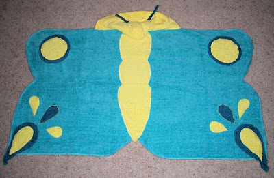 Here is the butterfly, in my daughter’s favorite color–turquoise, spread out so you can see how it looks when it isn’t wrapped around a child.