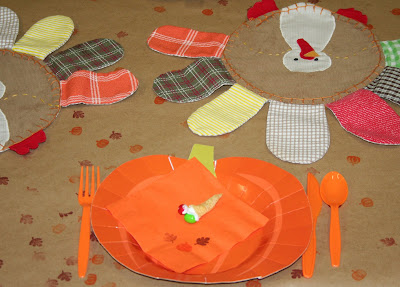 The cute pumpkin plates were from The Dollar Spot at Target. The cute Turkey place mats? My mom and I had made those a few years before, copying some very cute (and expensive) ones from Pottery Barn Kids. Yes, Mom did all of the sewing (what would I ever do with out her?), but I did do all of the hand stitching (embroidery).