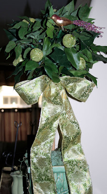 I threw these together with some wreaths and picks I got on an after Thanksgiving sale, and a ribbon that was waiting for me from last years’ after Christmas sales. Quick, cheap, and easy! (I need to start repeating that mantra!)
