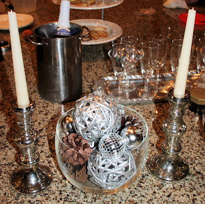 I had to scale down my original New Years Eve plan, since we all got sick between Christmas and New Years, and our party ended up being a rather intimate family gathering. Still, I had to pull out a few of the stops for my in-laws (who mostly smile and shake their heads at me–they don’t all share my insanity). We couldn’t use these blowers since we had put my nephew to bed and they were too loud, but they looked cool, either way. I know you agree, since I saw the same ones at other New Years Eve parties featured around blogland. Mine came from Walmart, as did the streamer shooters. Those were in the wedding section. The ornaments and silver tray are from the dollar store.