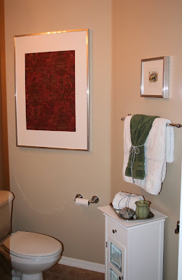 I LOVE LOVE LOVE CHANGING THINGS UP LIKE THIS. JUST ME SAYING THIS, BUT IF IT WERE MY BATH… I WOULD CHANGE OUT THE GREEN TOWELS TO THE RED IN THE PICTURE. I LOVE GREEN, MY HOUSE IS GREEN AND ORANGE AND WARM TONES BUT I THINK MATCHING THE COLOR IN THE PICTURE WILL ADD ANOTHER POP! (PROBABLY COST YOU $10.00 AT THE MOST IF YOU LOOK AT ROSS!!!) GOTTA LOOK AT ALL YOUR OTHER YUMMY IDEAS NOW!!