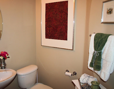 I’ve got an idea for something over your toilet that would also give you a clever way to display and store your towels. Get three (always a good number in decorating) handleless rectangular baskets (a nice dark cherry stain would look great with the deep red you’ve brought in with the wall paper) and arrange them in an interesting grouping over the toilet by screwing the bottoms of the baskets into the wall. Then fold and roll your towels and put them in the baskets.