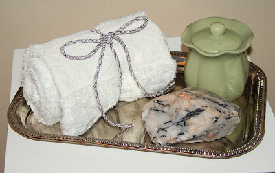 I added this silver tray (from the Dollar Store, of all places), and rolled up a decorative towel (hiding stains, again), and place it and a scented jar candle, on it. It needed something more, so I found a rock (quartz, I believe). BSB is a geologist, so there are lots of cool rocks all over our house. Let’s just hope it doesn’t get thrown at the mirror!