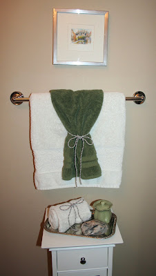 I LOVE the towels tied idea! The wallpaper in the frame adds color. And I so NEED one of those cute little trays from the Dollar Store. Fantastic!