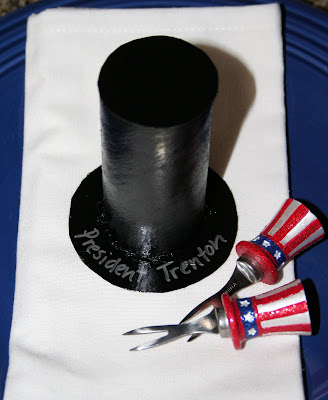 I took an empty paper towel roll and sawed/cut it into 2-3inch lengths. Then I used an empty cereal box to cut a couple of round circles–one the same size as the tube and the other an inch or so bigger in diameter. I glued them all together and then hit them with a couple of coats of black spray paint. The paint we had on hand was pretty glossy (hence the glare in the photo). If these are to be used as placecards, you can write names on them with a metallic marker. I decided my guests could have the title of “President” for the day.