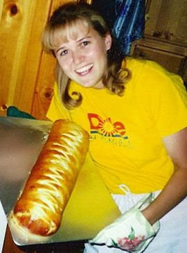 Thaw out the loaf/dough…don’t let it rise, just barely room temp. Work it out in to the shape of the pan (cookie sheet, rectangular). Once it’s touching all edges take a knife and make small slits up each side about 1″ apart (note: don’t make the slits too long or all your goodies will fall out and you’ll lose the cuteness/presentation factor). Layer your goodies…I prefer meat, kraut, dressing, cheese…repeated 2X. Tuck one end up and start “braiding” the cut pieces…when you get about 3/4 way down the loaf, fold the other end up and continue braiding. If you want it to be glossy, beat some egg whites and brush on…you can also sprinkle with fennel but personally I’m not a fan. Some people also brush with butter before/after…sometimes I don’t do anything if I’m not caring about the cuteness/presentation factor.