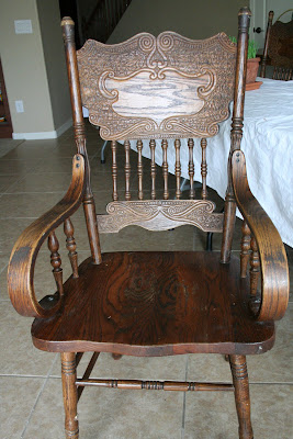 My Easter post will be coming soon, but I’d love some input from all of you brilliant bloggers and readers about this lovely (read sarcasm) piece of furniture. We inherited a decent table and four of these chairs a few months ago (Don’t you love how I never pay for things?). The table is oak, but will look really nice if I can get a dark stain on it. But for the record let me state that I hate these chairs! No offense to anyone who has them–they are all over the place–but I hate everything about them. The oak. The busy shape. and especially the busy carving design. To me it looks “wanna-be western.”