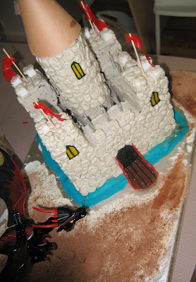 “The handles for the sword were just a strip of cardboard (the same cardboard as the shields, bent a little and attached with duct tape. It certainly won’t last forever, but they did all survived the party in pretty good shape. As for the cake, I’m not sure what to tell you about the fruit roll ups, except that they did work for me this time (I’ve had some experiences where the roll-ups I planned to use had images and words printed all over them–ugh). I did have a light-colored base-coat on the cake and that probably helped the fruit roll up colors show up well. Another option I’ve used on cakes is the Airhead candy rolled thinner and cut into the shape you want. Though I don’t know if I’ve ever seen yellow Airheads. . . The drawbridge was a Stretch Island fruit leather (I buy them at Costco and it was a last minute substitution after my graham cracker idea didn’t work) that I rounded on the top. The “chains” are just skinny strips of fruit leather that I twisted. Skinny licorice ropes would work well for that too (probably better).