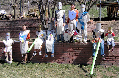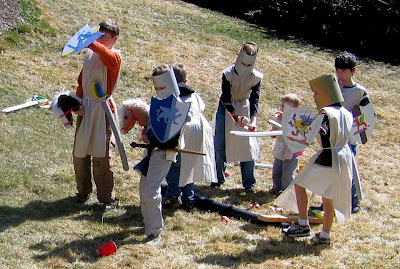 In the hiding place, they found all the gifts my sons’ friends had brought as well as a treasure chest with a glass goblet (decorated with sticky gems), a crown, and a final note announcing that now that the treasure was recovered, Sir Marcus could take his rightful place as King Marcus and everyone was invited to a royal feast to celebrate. At the dining room table, each place was set with silver paper plates and a decorated glass goblet that they got to take home (thank you, Dollar Store). The goblets were a big hit. One mom told me that her son insists on using his goblet most every day and then carefully hand-washes it so the sticky gems don’t come off. This idea came from the Family Fun website, and they have several other fun Knight party ideas as well