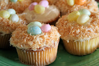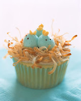 Clearly adding jelly beans is easier than piping birds, but both are cute. I loved how the toasted coconut turned out. It looks natural and tastes yummy! I only wish I had found long curly coconut like the kind they used in Martha’s cupcakes.