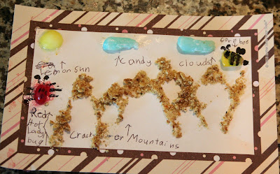 I don’t even have to explain it to you since she labeled everything clearly. I’m not sure what we call this medium. “Where food and art meet?” “Formerly edible insanity?” At any rate, I absolutely love her red hot ladybug and corn bee, both decorated with a Sharpie marker. And how clever are those cracker mountains, made from Elmer’s glue and cracker crumbs. I wonder if we should let our kids play with their food more often?