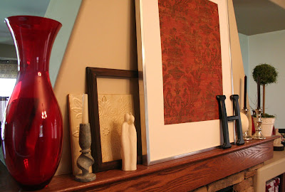 6-I blogged about this super-cheap work of art when I threw it together for Nester’s 10 min makeover project. It landed in my bathroom. My neighbor decided it belongs out here. I’m not sure about the silver frame in this room, but I love the rich texture and color of the wallpaper. This is less than $3. The frame was free, and I used a little bit of a roll of wallpaper I got on clearance from Lowes @ $3. Yes, I am cheap!