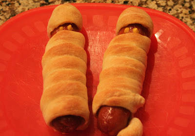 I try to stay out of the kitchen as much as possible these days (yes, I’m still pretty pukey, but hopefully will feel better, soon!). So at my request, he made these cute “mummy dogs” for dinner last night. I have seen this kind of thing featured around the internet at a few different sites lately, and it looked simple enough. And what was even better, we had the hot dogs, and a can of Pillsbury-type breadstick dough that needed to be used. It was a fun, quick, kid-friendly, way to get into the holiday mood (even better, since I didn’t have to do it. :-)!
