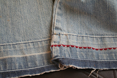 First, she brought down this pair of pants that had a big hole in the knee, and wanted them to be patched. I told her since she could wear them during a flood, she had better see if my mom could let down the hem at all, before they would be worth patching. Together, this is what they came up with. To reinforce the fold that had previously been the bottom of the pants, my mom did this fun decorative stitch.