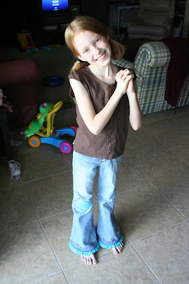 She let Kira choose the fabric and cut out the patch in what ever shape she wanted. Neither my mom or I were thrilled about the turquoise against the denim, until they decided to outline it with the red thread. Then she sewed the cute ruffle on the bottom.